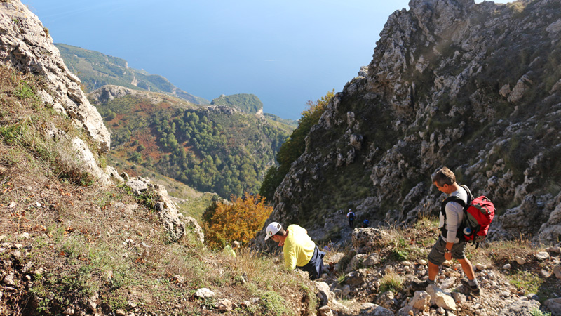 Fra Amalfi går du langs en av de eldste stiene i den middelalderske Amalfi Maritime Republic, «Maestra dei Villaggi», eller «hovedveien til landsbyene», en gammel asfaltert muldyrsti som kan dateres tilbake til 800-tallet. Du passerer de små landsbyene Lone og Vettica, før du kommer til det imponerende klosteret Santa Rosa (det er også mulig å ta en lokalbuss hit, men da slipper du en stigning på 300 meter!) Herfra går turen først til den sjarmerende lille landsbyen Conca dei Marini, hvor du har en fantastisk utsikt både over Amalfi og mot vestspissen av halvøya. Deretter går ruten ned til kysten igjen langs noen sjarmerende kirker som ligger vakkert plassert over klippekysten. Du kommer ned i den spektakulære fjorden Furore, med den sjarmerende fiskerlandsbyen under de ruvende kalksteinsklippene. Herfra går dere oppover igjen, forbi landsbyen og kirken Sant'Elia for å så ta «Via dell'Amore» inn i Praia-dalen. En flott siste etappe gjennom skog, vinmarker og middelhavskrubber fører dere til kystlandsbyen Praiano, der dere skal bo de neste to nettene. En valgfri nedstigning til den svært pittoreske innseilingen til Marina di Praia, den gamle lille havnen i Praiano, er verdt innsatsen!