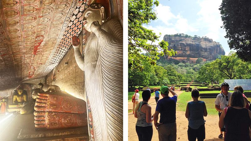 På sykkeltur til Sri Lanka reiser vi i historie og samtid ved å bruke alle sansene fra sykkelsetet. Vi lar ikke borgerkrig og det korrupte styret få være hovedaktører– vi reiser i mulighetenes verden og har blikket rettet innover og fremover. Fra sykkelsetet frydes vi over lydene av tuk-tuker som frakter brød til folket akkompagnert av Beethovens toner. Det tutes og selges, politisk budskap ropes fra høyttalere, mens vi glir gjennom et gjestmildt landskap. Vi går av sykkelsetet og hjelper de lokale med å trekke opp et fiskegarn med dagens fangst, en fangst vi nyter til kveldens “rice and curry”. Vi sykler innom familier og lærer å lage kokos-sambol. Erfaring hjelper oss å styre unna den sterkeste chilien, det er nok av varme i dagliglivet. Alle på reisen kjenner seg så velkomne. Å klatre i palmene overlater vi til lokalbefolkningen, men vi syklende nyter gjerne en stopp med kokosnøtt med sugerør i varmen.