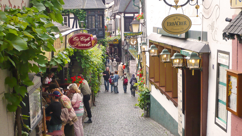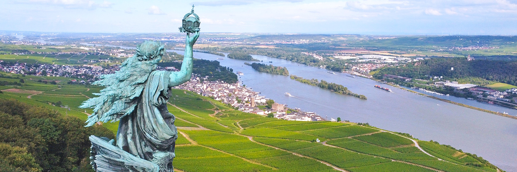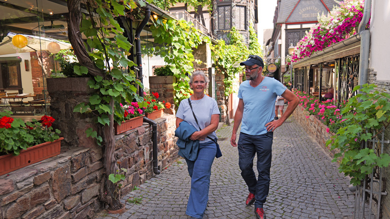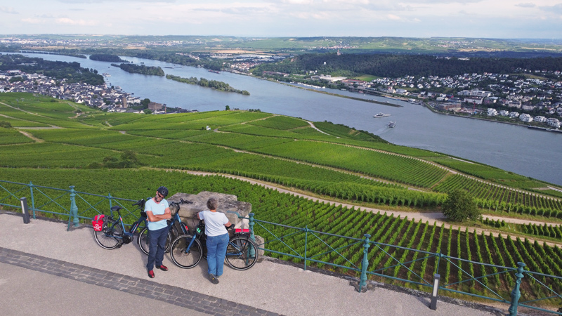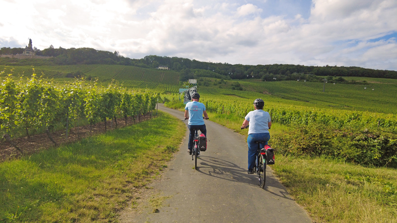 Den første sykkeldagen går på sykkelveien langs Rhinen. I dag blir det sykling gjennom den smaleste, bratteste, og kanskje mest imponerende delen av Rhinedalen. Nyt utsikten over Loreley-klippen som rager høyt over elven på vei til Oberwesel. Så via Bacharach til Bingen. På en liten øy i Rhinen ved «Binger-Loch»-smalningen, ser du det middelalderske Mäuseturm (Musetårnet). Sammen med Ehrenfels slott på motsatt side fungerte dette tårnet, som er rundt 25 meter høyt, som et vakttårn og tollkontor for innkreving av Rhinen-toll. I Bingen krysses elven med ferge (ikke inkludert) til vinbyen Rüdesheim som er dagens endestasjon.