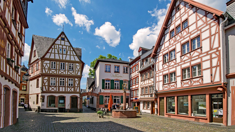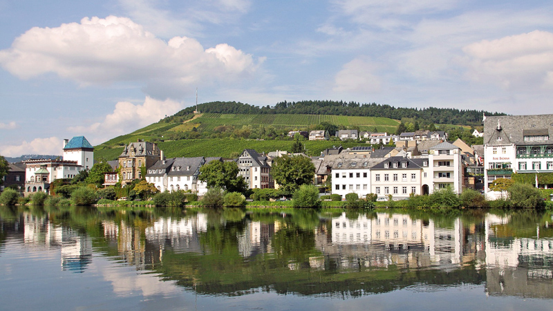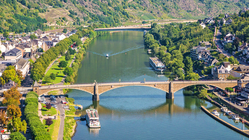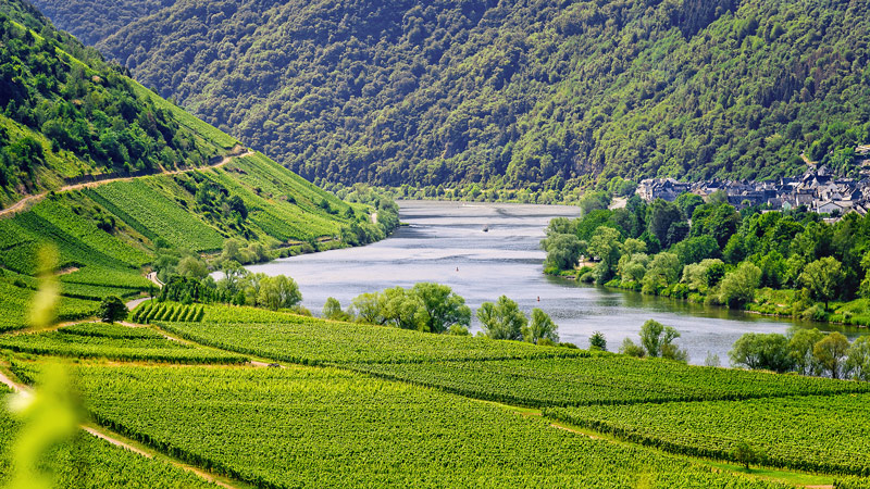 Gjennom UNESCOs verdensarvområde Øvre mellomrhindal, hvor den berømte Loreley-klippen og andre imponerende landskapsformasjoner venter på deg. Rundt 40 slott, palasser og festninger ruver høyt over begge bredder, mens pittoreske landsbyer og byer ligger som perler på en snor langs elven. Så videre langs Moseldalen, kjent for sine riesling-viner, men også fantastiske utsikter, eventyrslott og mye mer. Beilstein, Traben-Trarbach og Bernkastel-Kues er bare noen av stedene du møter langs ruten.