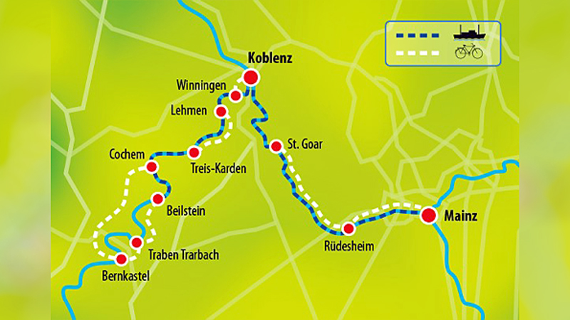 Turen går tur/retur den historiske byen Koblenz, som med sin beliggenhet rett ved samløpet mellom Mosel og Rhinen, er et ideelt utgangspunkt for turen. Med hotellskipet Arkona som stadig følger deg, trenger du ikke å bekymre deg for noe – ønsker du en pause fra syklingen, kan du alltids bli om bord og nyte det fantastiske landskapet fra båten.