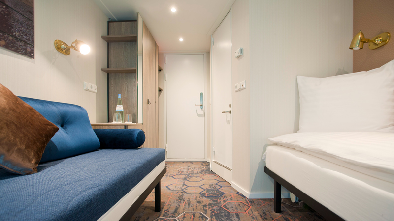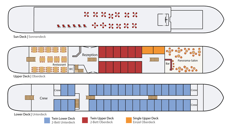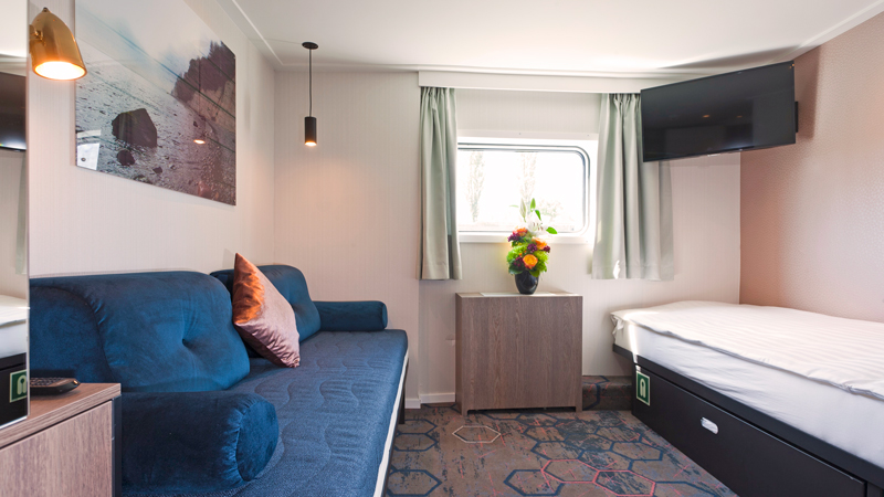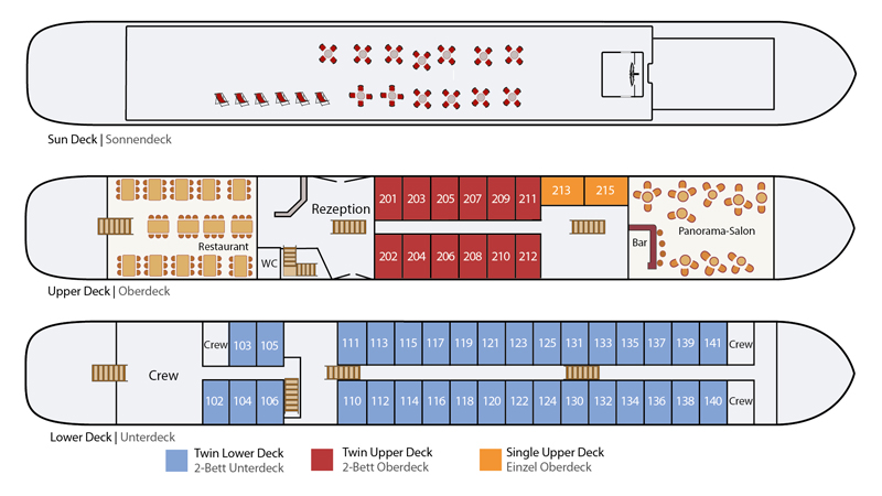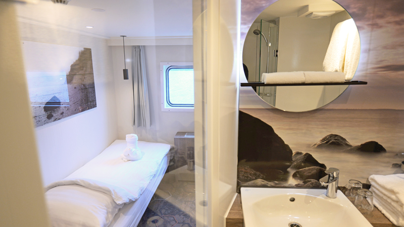 Nedre dekk har 33 tomanns-kabiner med vinduer, som av sikkerhetsmessige årsaker ikke kan åpnes. Øvre dekk har 12 tomanns-kabiner med panoramavindu fra gulv til tak, hvor den øvre halvdelen kan åpnes, og 2 enkeltkabiner med en liten dobbeltseng (140cm) og et vindu som kan åpnes. Alle tomannskabinene har to separate enkeltsenger som kan gjøres om til sofa om dagen. Alle lugarene har individuelt klimaanlegg, tv, garderobe, minisafe, hårføner, 230 V og 115 V stikkontakter og eget bad med dusj, toalett og vask.