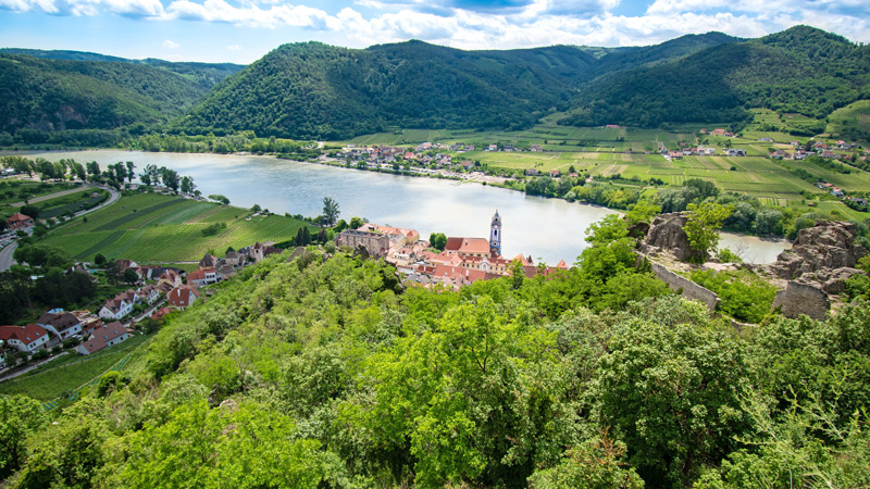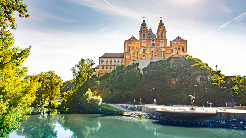 Den siste sykkeldagen er et spesielt høydepunkt! En mektig ruin ruver over den lille barokkbyen Durnstein, mens klosterkirkens blå spir er et landemerke i den berømte Wachaudalen. Dette kuperte landskapet med drømmeaktige byer, aprikostrær, vingårder og slott, fortryller alle som kommer på besøk. Tradisjonelle vinbarer langs sykkelstien inviterer til å smake på lokale viner (vinsmaking valgfritt). Benediktinerklosteret i Melk, som ligger på en høyde med utsikt over Donau, er et sant arkitektoniskt vidunder.