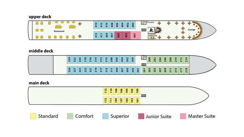 Superiorlugar: På mellom- og øvredekk, dobbeltseng som kan skilles, fransk balkong.