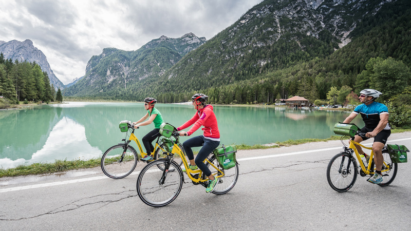 På den første sykkeldag følger du sykkelstien på tog-traseen til den tidligere «Dolomitten Bahn». Ta en pause og smak på Apfelstrudel underveis. Snart får du en panoramautsikt over fjellformasjonen «Drei Zinnen – Three Peaks», selve symbolet for Dolomittene (på UNESCOs verdensarvliste siden 2009). Dalen åpner seg opp mot sør når du kommer inn til Cortina d'Ampezzo. OL-byen fra 1956 ligger på 1200 moh og er langt mer enn bare et elegant vintersportssted. I området finner du mer enn 400km med turstier og 13 heiser/taubaner som fører opp til fantastisk panoramautsikt. Cortina hører inn under regionen Veneto (ikke Sør-Tyrol), og er sterkt preget av italiensk kultur.
