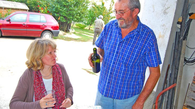 Tilbake til denne vanlige sykkeldagen for 12 år siden; Sammen med 20 småsvette sykkelvenner tar vi en vannpause på bakketoppen, tett ved solmodne vinranker vis-a-vis inngangen til en unnselig liten gård. Ut av porten kommer en middelaldrende kvinne for å bli kvitt et par søppelposer. Jeg spør henne om vindruene tilhører hennes gård.