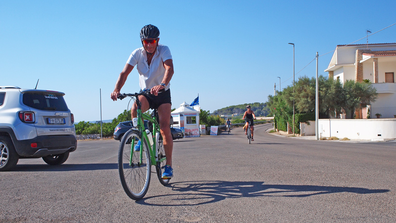 Sykkelruta går i dag ut mot det Joniske hav og Tarantobukta, gjennom småbyer som Porto Cesario, Torre St. Isidoro og Santa Caterina. Ta en stopp ved et av tårna langs kysten, som alle representerte en rekke av flere forsvarsverk mot tyrkisk invasjonsfare. I Porto Cesario kan dere f.eks spise pizzalunsj på den lokale pizzeriaen «Da Tonino». Derfra langs kystveien retning Gallipoli. Dere har tid til en barstopp i Santa Catarina og en dukkert hvis ønskelig. Gallipoli med den idylliske gamlebyen, i virkeligheten ei øy tilknyttet fastlandet med bro, ble opprinnelig grunnlagt av grekerne og kalt «Kali-polis» (Den vakre byen). En spasertur i byen anbefales!