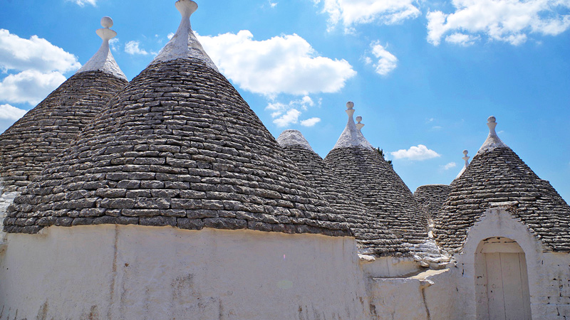 Alberobello ligger i et enestående arkitektonisk, UNESCO-beskyttet område. De sylindriske, hvitvaskede trulli med sine grå, steinbelagte og konformede tak er fortsatt noe av et lokalt mysterium. Overnatting på hotell i Alberobello.