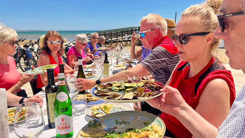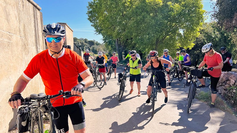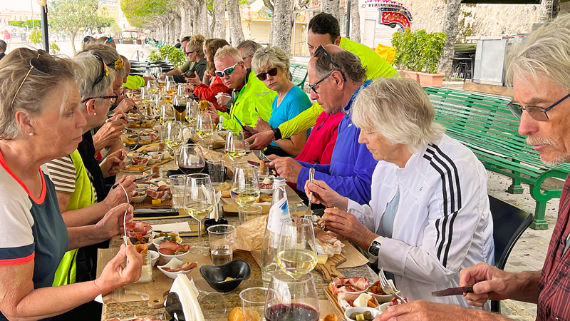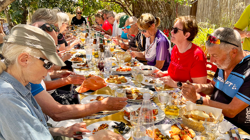 Vi ser at vi er på vei inn i et veiskille med elsykler kontra vanlige sykler. Elsykler gir flotte sykkelopplevelse til de som i utgangspunktet ville slitt i bakker og lange strekninger. Det er positivt. Men det gir også utfordring for guidene. I det vi treffer på en stigning deler gruppen seg. Er det mye stigning, kan man plutselig befinne seg helt alene, uten å se noen verken foran eller bak, men Marit i bakgruppen plukker jo alltid opp alle.