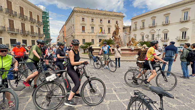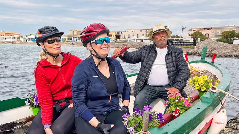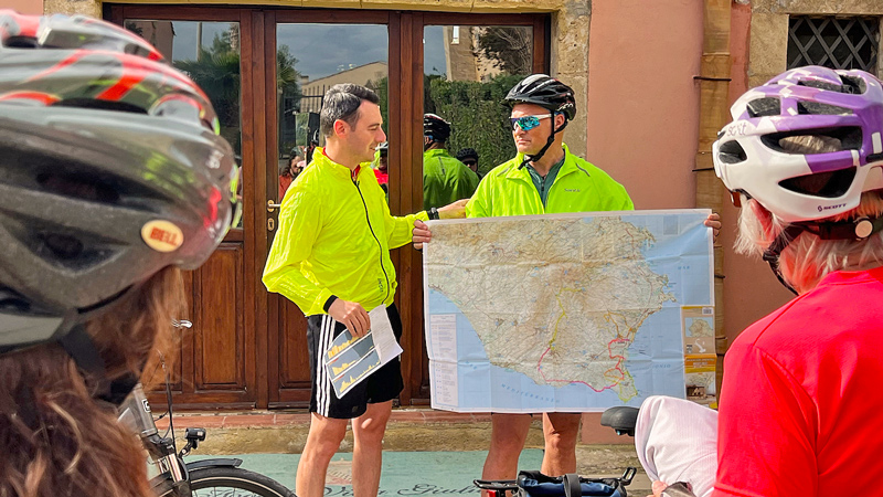 Vi kommer rett fra Sicilia, og sitter med mange gode minner. Det første vi vil si er at der har dere virkelig gode samarbeidspartnere! Kjemien mellom Marit og Davide er helt unik. De fungerer så godt sammen at det er helt utrolig. For første gang har vi også hatt en sjåfør som kjører foran og stiller seg opp i alle store kryss og stopper trafikken og vinker oss igjennom. Syklene er kjempegode.