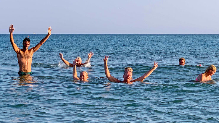 En aperitiff i gamlebyen Terrachina i solnedgang før middag, servering av bobler etter et bad i svovelkulper hos Oasi di S. Valentino og fotballkamp på stranda i Terrachina mellom «Norge og Italia.» (Hvem som vant strides det fortsatt om).